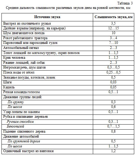 Слышимость различных звуков в тихую несолнечную погоду на ровной местности характеризуется данными, приведенными в табл. 3.