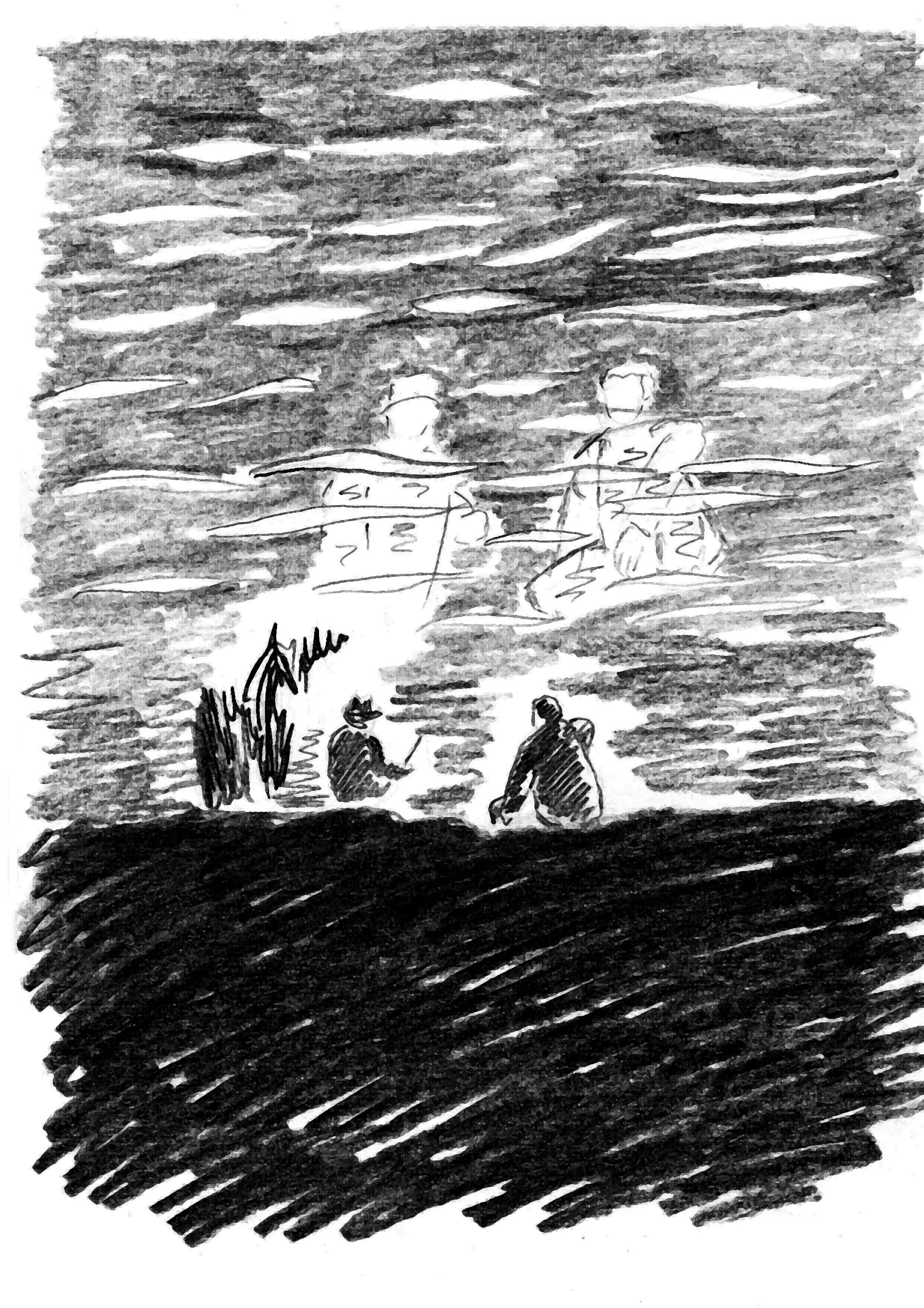 Как будто экран поднялся над черной поверхностью воды озера. Призрачный экран, в котором отражались собеседники у костра. Этот экран дрожал от ряби. Как будто вода озера приняла перпендикулярное положение.