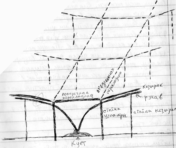Два рукава подвешиваем к козырькам, как показано на рисунке. А другие рукава вешаем на продольные и поперечные перекладины, как удобней. Высоту, длину стоек, перекладин и козырьков каждый устанавливает сам, как ему удобней.