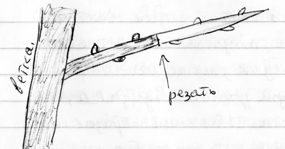 Обрезка осенью первого года или весной второго. Стрелкой показано место, где резать, не заштрихованное – отрезаемая часть: