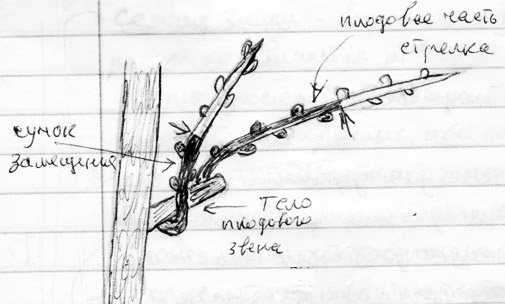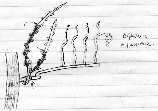 Обычно на юге с ростом куста закладывают каждый год новые звенья до какого-то числа, потом закладывают для замены постаревших. Весной любой удачный ростовой побег (лозу) обрезаем в нужном месте, из двух верхних почек вырастим без кистей два побега – вот и все. Верхний побег – будущая стрелка, ниже – будущий сучок. Вот и новое звено. Надо только его зафиксировать на шпалере.