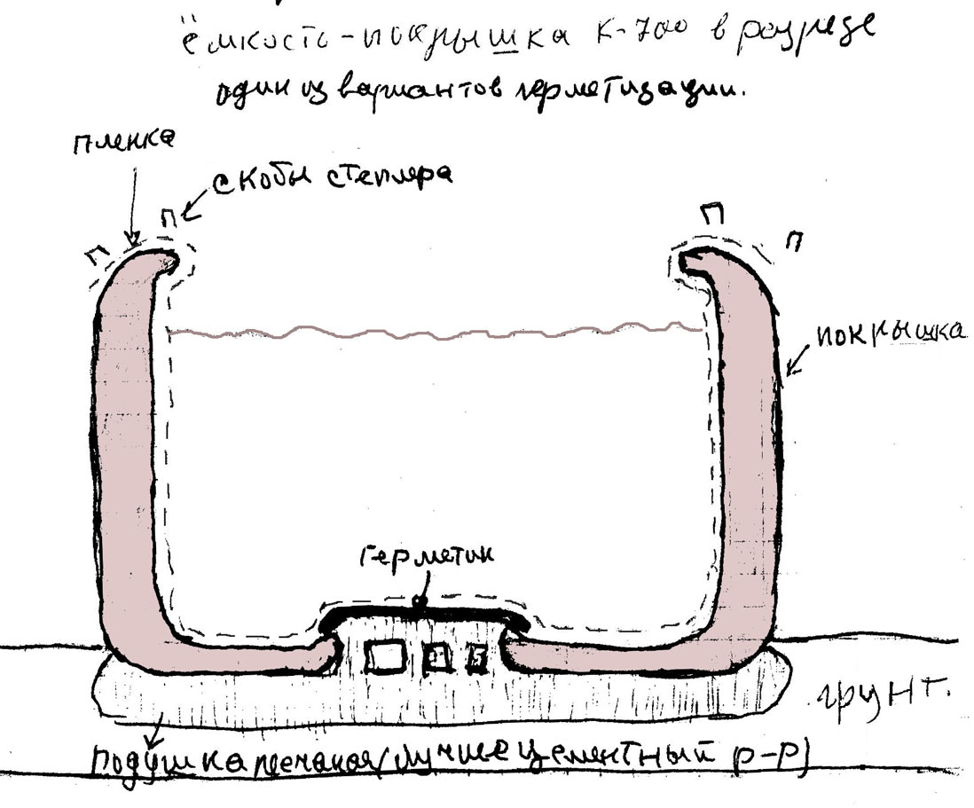 Нужно несколько человек, чтобы установить на место покрышку. Идеальный вариант – приподнять и аккуратно положить на подготовленную "постель". Отверстие в нижней боковине заливаем тем же раствором. Можно сначала положить несколько кирпичей для экономии раствора. Сверху замазываем раствором вровень с краем боковины. После отвердения раствора шов заливаем расплавленным битумом или герметиком, или смазываем каким-нибудь долговечным клеем и положим кусок негниющей ткани. Способов герметизации много, думайте сами.