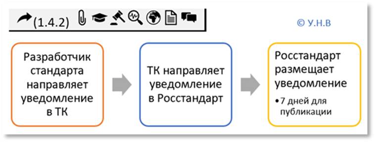 Порядок разработки и утверждения национальных стандартов представлен на рисунке 1.3. Как видно из рисунка все процессы носят уведомительный характер, т.е. у регулятора нет оснований для отказа в приёме уведомления. Уведомительный принцип часто используется в либерально-демократической системе управления, например, для организации митинга в Москве и других Российских городах, организаторы уведомляют, а не спрашивают разрешение у глав города. Аналогичные уведомления, а не разрешения, направляют специалисты информационной безопасности в Роскомнадзор для получения статуса оператора обработки персональных данных.