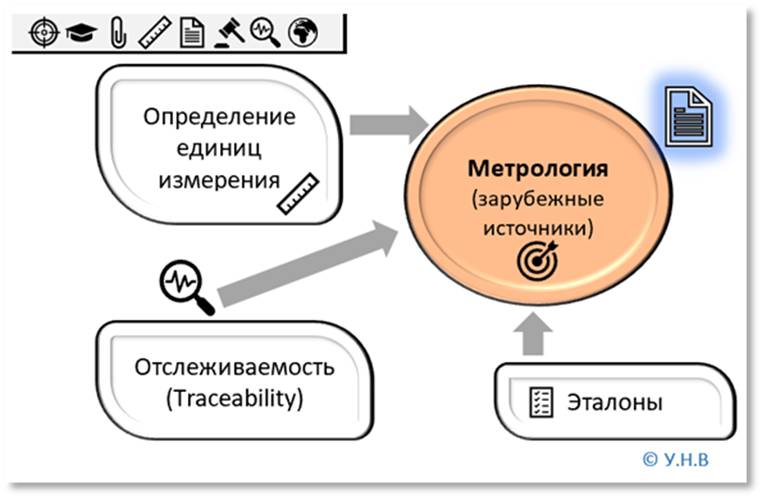 Метрология – обширная область знаний, которую можно свести к трём основным направлениям: определение общепризнанных единиц измерения, отслеживаемость и реализация этих единиц измерения на практике с определением эталонов [45, 46]. На рисунке 1.13 показаны особенности трактовки термина метрология в научных зарубежных источниках.