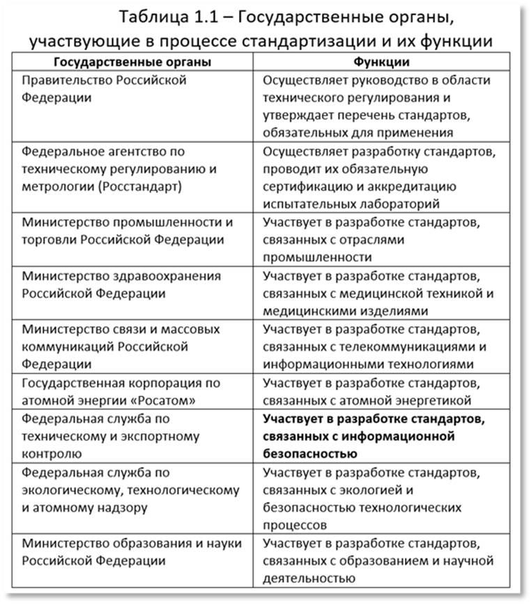 Почти все государственные органы участвуют в процессе стандартизации. Как видно из таблицы 1.1, функции таких органов сведены к осуществлению руководства и утверждению перечня стандартов, обязательных для применения. Конечно, само правительство не разрабатывает стандарты, а только осуществляет руководство.