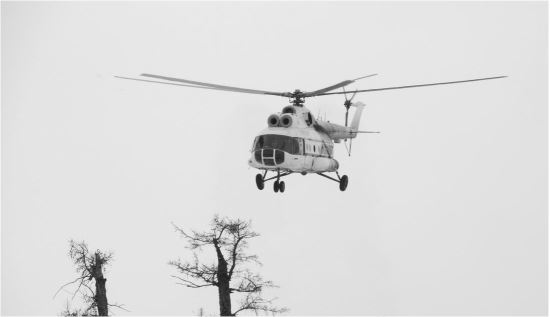 Совершим круг над посёлком, заложив крутой вираж и громким свистом разрезая лопастями морозный воздух, заметно заваливаясь на левый бок, вертолёт стал, с подбором площадки, снижаться на безлюдном, заснеженном мысу южнее базы Самбургской группы геофизических партий. Натужно ревя двигателями вертолёт завис в метре от земли, громадные лопасти подняли снежную пыль и, огромный корпус винтокрылой машины, скрылся в снежном мгле. Коснувшись поверхности земли и совершив несколько подпрыгиваюших движений борт, снижая обороты винта, плавно опустился на грунт. Отворилась передняя дверь, и спустили трап. От стоявшей рядом машины выскочили несколько человек и, прикрывая лица от ветра и снега, пригнувшись, побежали к вертолёту. Убрали трап, закрыли дверь, взревев двигателями, вертолёт оторвался от земли и, вышвыривая куски снега, круто набирая высоту, стал удаляться на юг.
