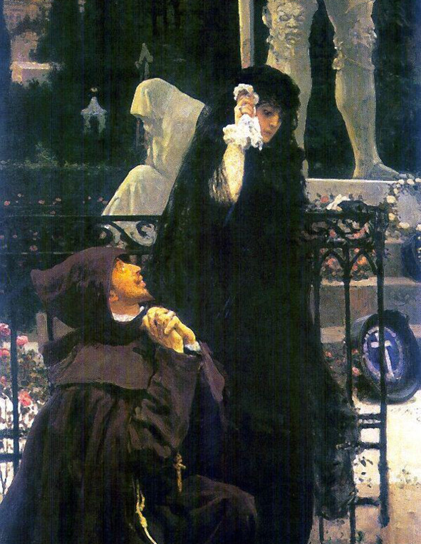Дон Жуан демонстративно выехал на середину улицы и громко потребовал, чтобы слуга божий посторонился. Тот сделал шаг в сторону. Самодовольно усмехнувшись, дон Жуан проследовал дальше. Но проехав несколько шагов, молодой аристократ ещё раз оглянулся на необычного монаха. И то, что он увидел, заставило его оторопеть. Оказалось, что за широкой спиной священника скрывалась прелестная девушка, переодетая в грубый мужской костюм. Она повернула голову и удостоила всадника своим взглядом.
