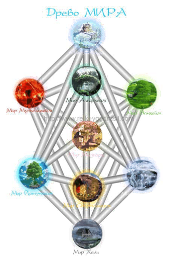 Мировое Древо Иггдрасиль – это строение сознания самой Вселенной, имеющее кристаллическую структуру. В основе Древа Иггдрасиль находится центральная ось (ствол), включающая в себя миры Хель, Свартальхейм, Альфхейм и Асгард, вокруг которой формируется энергетическое пространство (корни и ветки), вмещающее в себя все многообразие миров – Муспельхейм, Нифельхейм, Мидгард, Ванхейм и Йотунхейм.