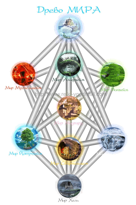 Мировое Древо Иггдрасиль – это строение сознания самой Вселенной, имеющее кристаллическую структуру. В основе Древа Иггдрасиль находится центральная ось (ствол), включающая в себя миры Хель, Свартальхейм, Альфхейм и Асгард, вокруг которой формируется энергетическое пространство (корни и ветки), вмещающее в себя все многообразие миров – Муспельхейм, Нифельхейм, Мидгард, Ванхейм и Йотунхейм.