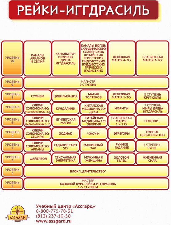 Базовый курс «Рейки-Иггдрасиль» содержит 5 ступеней, пройти его можно за 5 недель (одна ступень – одна неделя). По завершении работы с 5-й ступенью выдаётся диплом Мастера системы «Рейки-Иггдрасиль».
