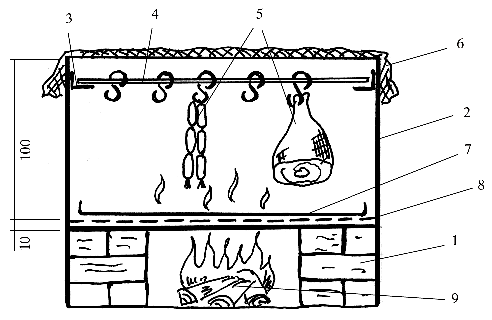 1 – кирпичи; 2 – металлический ящик; 3 – уголки; 4 – решетка или стержень с крючками; 5 – мясные полуфабрикаты; 6 – покрывало из мешковины; 7 – поддон; 8 – решетка; 9 – дрова в топке.