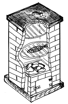 В богатых домах и поместьях делали отдельные коптильни из камней, кирпича или металла в виде высокого столбца, верх которого герметично закрывали крышкой и промазывали все щели глиной. С одной стороны столбика проделывали два окна с небольшими дверцами. Первое предназначалось для подвешивания продуктов внутрь, на вделанные в стены камеры крючья, а второе – для закладки топлива и слежения за огнем.