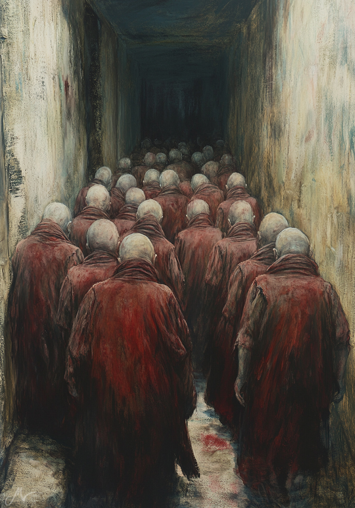 Спавшие свернувшись клубком женщины в однотонных безликих платьях старого больничного типа одна за другой просыпались, словно их биоритм был точно синхронизирован со световым днём. Та, что неуклюже поднялась на ноги первой, прошла мимо меня, вдавившейся в стену, к санузлу. Он, кстати, оказался там же, всего в нескольких метрах, и комнатой совсем не являлся. Это были просто несколько чашей Генуя из нержавейки. Всё у всех на виду!