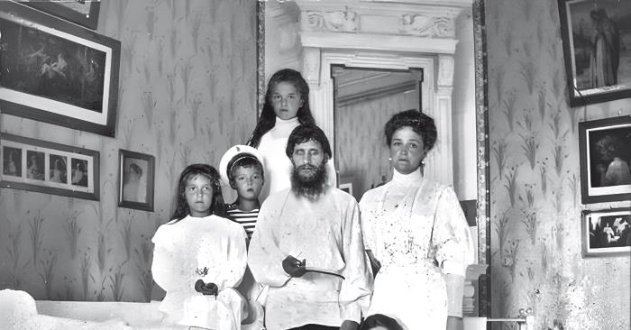 Григорий Распутин с членами царской семьи, 1915 год.