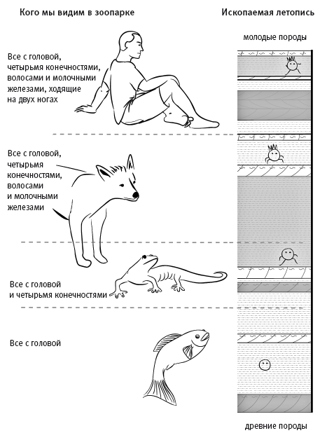 Неудивительно, что в колонке горных пород содержится последовательность ископаемых организмов. Менее очевидно, что на основании сравнения ископаемых видов с современными мы можем довольно точно предугадывать, как будут выглядеть организмы, которые мы обнаружим в том или ином слое. Накопленные знания дают нам возможность заранее предвидеть, какие ископаемые будут обнаружены в определенном слое древних пород. Более того, последовательность ископаемых можно во многом предсказать, основываясь лишь на сравнении нас самих с животными из какого-нибудь зоопарка или аквариума.