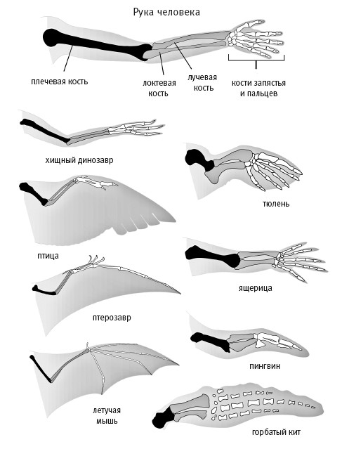 Оуэн открыл, что наши руки и ноги, в том числе кисти и ступни, соответствуют некой общей для многих животных схеме. Анатомы и задолго до Оуэна знали схему строения скелета человеческой руки: одна плечевая кость, две кости предплечья, набор из девяти маленьких косточек запястья и пять пальцев, состоящих из нескольких последовательно соединенных костей. Скелет ноги устроен сходным образом: одна кость, две кости, много маленьких косточек и пять пальцев. Сравнивая эту схему со схемой строения разнообразных скелетов, привезенных со всего света, Оуэн сделал замечательное открытие.