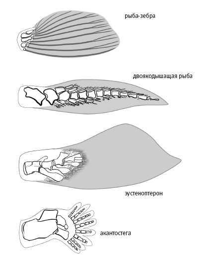 Эустеноптерон (второй снизу) показал, как заполнялся промежуток между рыбами и наземными животными: у него уже имеются кости, подобные нашему плечу и предплечью. Акантостега (внизу) повторяет структуру конечности эустеноптерона за тем исключением, что у нее уже наличествуют полностью сформированные фаланги пальцев.