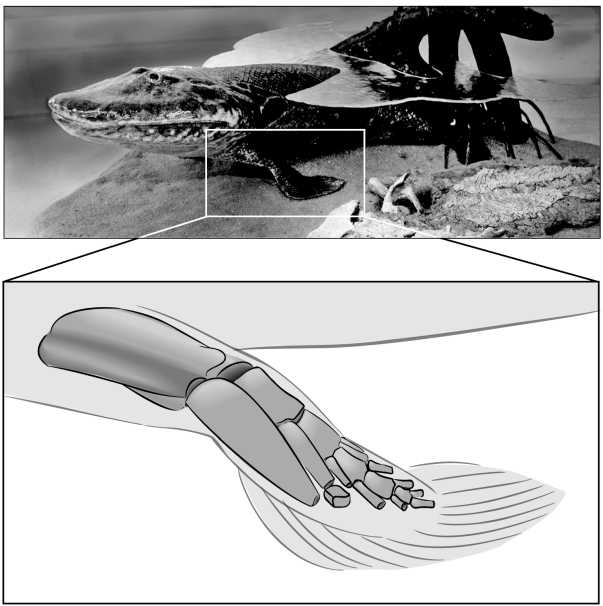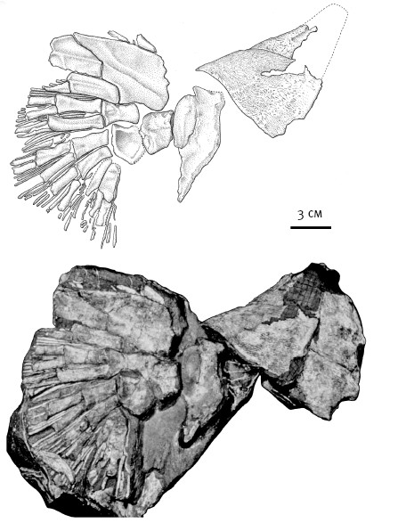 Реконструкция тиктаалика в натуральную величину (вверху) и рисунок его плавника (внизу). В этом плавнике есть плечо, предплечье и протозапястье, которые позволяли тиктаалику выполнять что-то вроде отжиманий.