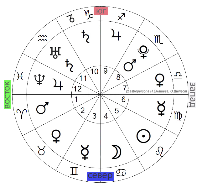 Горизонт и Меридиан делят символический гороскоп на половинки, которые называются полусферами: верхняя полусфера – дневная или Южная, нижняя – ночная или Северная. Левая полусфера – Восточная, правая – Западная.