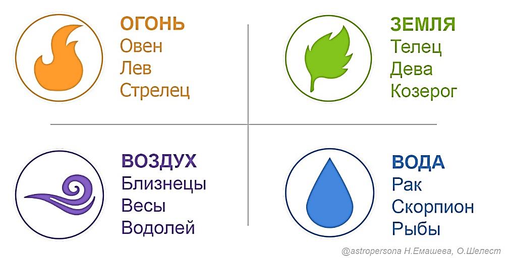 К мужскому началу Ян относятся знаки Огня и Воздуха, к женскому началу Инь относятся знаки Земли и Воды.