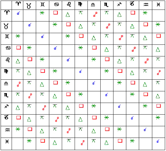 Таблица аспектов поможет Вам безошибочно определять аспекты между планетами.