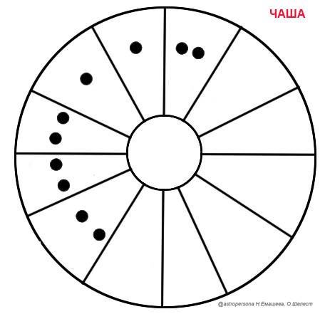 № 2. «Чаша» образуется в случае, когда половина зодиакального круга – 180 градусов, занята планетами, а другая половина пуста. Классическая «Чаша» – между крайними планетами образуется оппозиция, которая и дает основное напряжение в реализации человека.