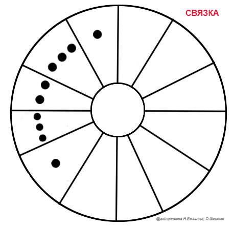 Последовательность интерпретации «Связки» аналогична интерпретации «Чаши», только в «Связке» не рассматривается стрела компенсации. При анализе этих конфигураций, в первую очередь, следует обратить внимание на квадранты и полусферы, в которых расположены планеты.
