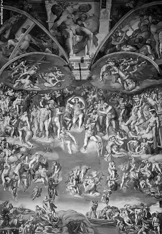 – А мне не очень нравится эта картина, – призналась Маня. – Она какая-то страшная… – Ещё бы, ведь эта картина называется «Страшный Суд». В этой картине – всё ваше Священное писание. Здесь и Богоматерь, и пророки, и апостолы, святые и грешники. Вот Адам, как зачинатель рода людского, согласно вашего Ветхого Завета, и святой Пётр – основатель вашей религии. Чуть ниже – святой Варфоломей, показывает свою содранную кожу. У ног Христа – семь ангелов, трубят в семь труб и призывают на Суд. На мой взгляд – это самое выдающееся произведение вашего мира. И не только потому, что у него космический масштаб, техника живописи просто гениальна! Каждая фигура выписана как миниатюра, а ведь эта роспись занимает очень большую площадь.