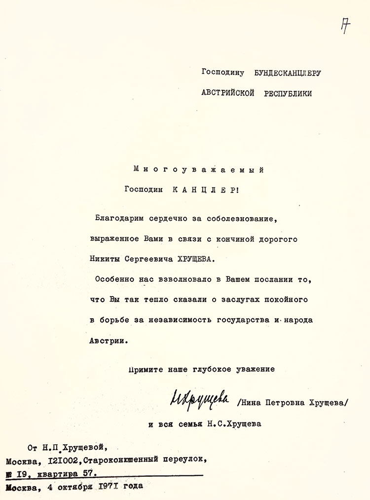 Ответ на соболезнования по поводу смерти мужа Н. П. Кухарчук (Хрущевой) канцлеру Австрии Бруно Крайскому