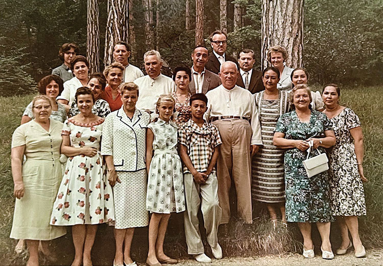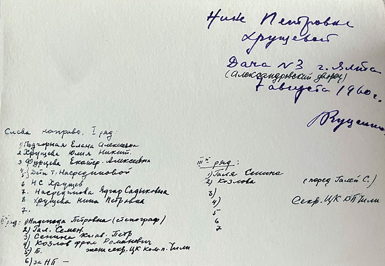 Ю. Н. Хрущева (Гонтарь), Е. А. Фурцева, Ф. Р. Козлов (во втором ряду), Н. С. Хрущев, Н. П. Кухарчук и другие (с подписью Н. П. Кухарчук)