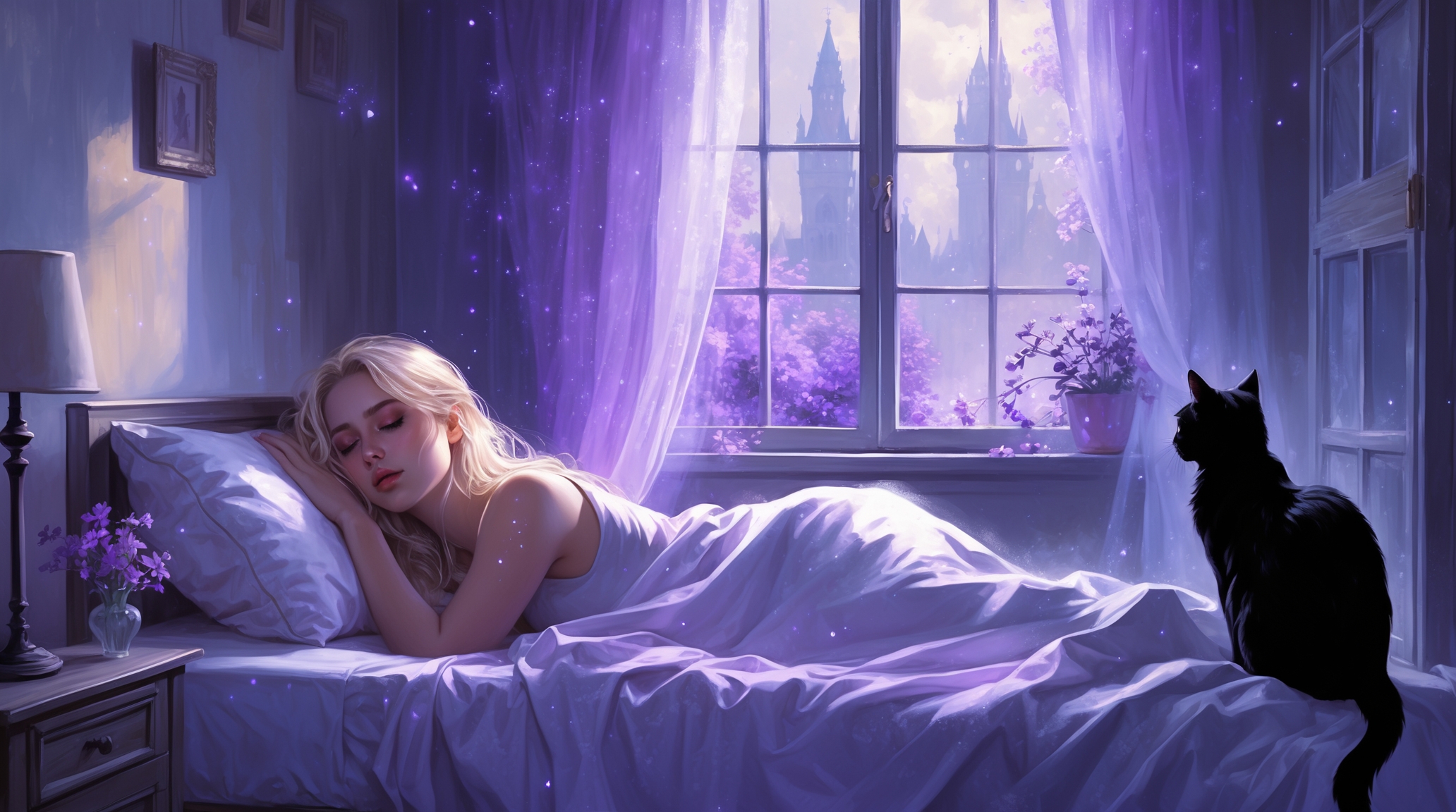 В лучах фиолетового светаЗвон будильника разрезал тишину спальни, заставив Лину недовольно поморщиться. Она протянула руку, нащупывая источник раздражающего звука, и наконец смогла его отключить. Сквозь прикрытые веки проникал мягкий фиолетовый свет – тот самый, что дарила ей гирлянда на окне. Маленькие светящиеся шарики на тонкой леске колыхались от легкого сквозняка, создавая иллюзию застывших в воздухе капель лавандового дождя.