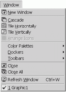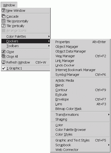 Рис. 2.23. Команды пункта меню Window с раскрывающимся списком команды Dockers