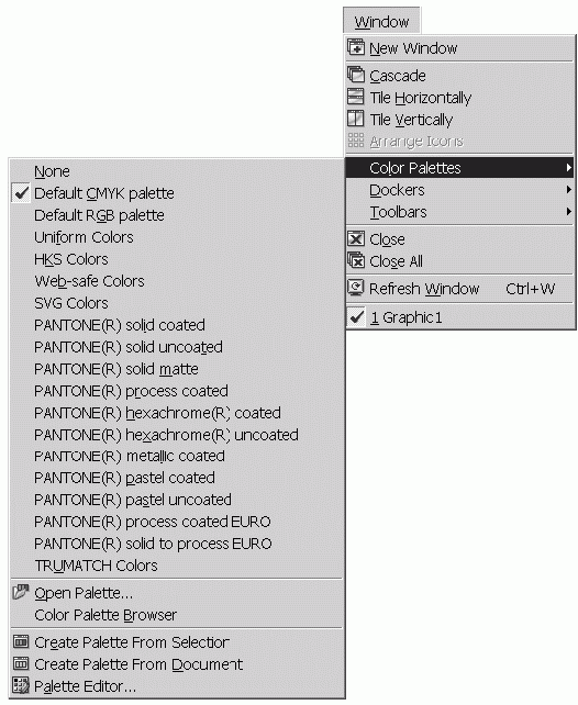 Рис. 2.22. Команды пункта меню Window с раскрывающимся списком команды Color Palettes