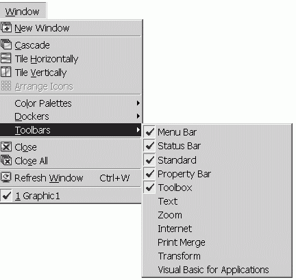 Рис. 2.24. Команды пункта меню Window с раскрывающимся списком команды Toolbars