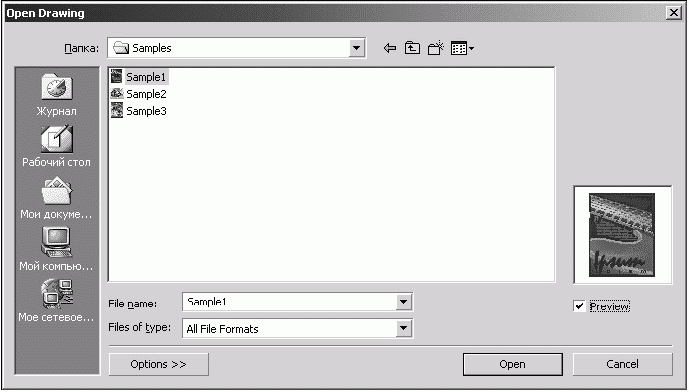 ♦ Область предварительного просмотра. Ниже кнопок Open (Открыть) и Cancel (Отменить) располагается область предварительного просмотра. Если в области выбора файла выделено какое-нибудь имя, то в области просмотра вы увидите миниатюру иллюстрации, находящейся в этом файле. Предварительный просмотр облегчает выбор нужного файла, особенно, если его имя неинформативно. Данный режим несколько замедляет работу в диалоговом окне Open Drawing (Открытие документа) и может быть отключен снятием флажка Preview (Просмотр).