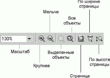На ней появляются раскрывающийся список масштабов (как на стандартной панели), кнопки ступенчатого изменения масштаба Zoom In (Крупнее) и Zoom Out (Мельче), а также его стандартных значений: