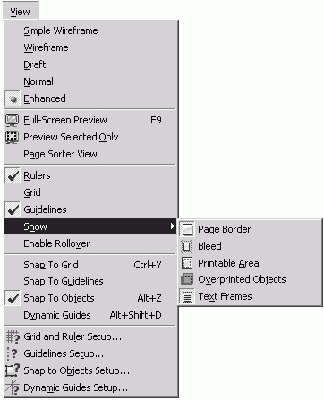 На рис. 2.29 показаны командами пункта меню View (Вид) с раскрывающимся списком Show (Показать). Можно показать страницу в рамке, страницу без полей, печатную область, перекрывающиеся объекты или текстовые блоки.
