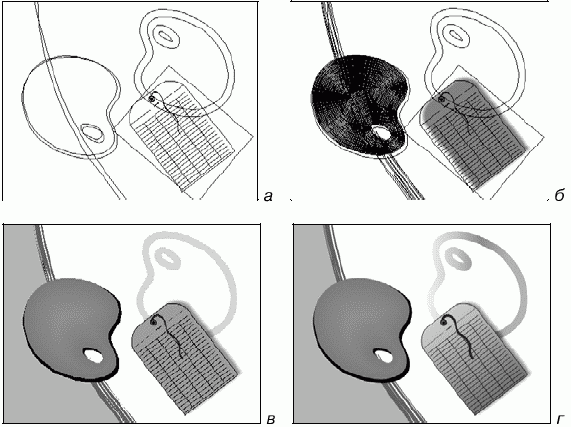 ♦ Wireframe (Каркас). Аналогичен предыдущему режиму, но упомянутые эффекты отображаются полностью (рис. 2.34, б).
