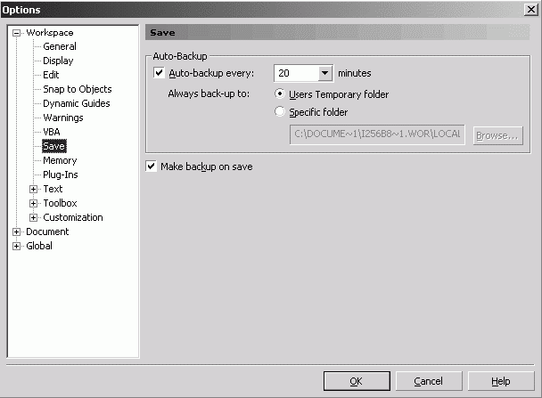 CorelDRAW по умолчанию автоматически сохраняет текущий документ каждые 20 минут и создает его страховочную копию под тем же именем, но с приставкой Autobackup_of_. Поэтому, если рабочий документ по каким-либо причинам испорчен, откройте страховочную копию, находящуюся в той же папке. При работе с большими иллюстрациями столь регулярное страховочное копирование может отнимать много времени. В таких случаях многие предпочитают делать его реже или отключать. Этим пользователь снимает с CorelDRAW ответственность за страховочное копирование и берет ее на себя. Настройки режима автоматического сохранения находятся в разделе Save (Сохранить) диалогового окна Options (Параметры) (рис. 2.35). Флажок Auto-backup every … minutes (Резервную копию каждые … минут) включает автоматическое сохранение открытого документа. Расположенное рядом поле ввода задает период сохранения (по умолчанию оно делается каждые 20 минут). Переключатель под флажком Always back-up to (Резервную крпию в …) указывает место хранения страховочной копии: Users Temporary folder (Временная папка пользователя) или Specific folder (Специальная папка), которая может быть выбрана при просмотре каталогов Browser (Просмотр).