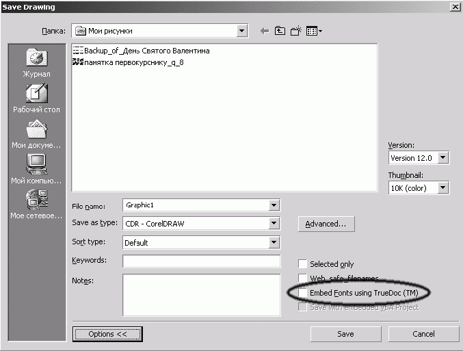 8. В списке Version (Версия файла) задается номер версии CorelDRAW, в которой этот документ будет редактироваться дальше. В подавляющем большинстве случаев следует использовать вариант Version 12.0, соответствующий текущей версии. При сохранении документа в форматах ранних версий вы потеряете все эффекты, созданные с помощью новых средств CorelDRAW 12. Оставьте вариант, предлагаемый по умолчанию.