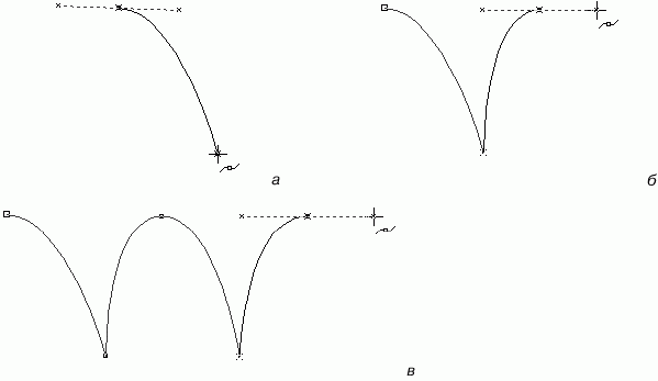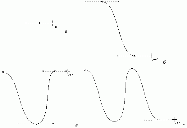 3. Не отпуская кнопку, перемещайте мышь по горизонтали вправо. За курсором потянутся управляющие линии. Пусть они будут примерно такой длины, как показано на рис. 3.4, а. Длина управляющих линий определяет кривизну сегментов.