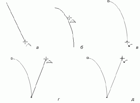 4. Сместите курсор вправо и вверх – линия сегмента станет кривой (рис. 3.6, б). Перемещая курсор, отрегулируйте кривизну сегмента. Когда сегмент приобретет нужную форму, зафиксируйте ее щелчком мыши. Первый сегмент построен.