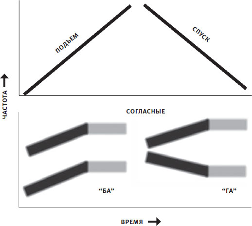 Различие между согласными в слогах “ба” и “га” определяется изменением частот полос акустической энергии во времени (нижняя панель). Верхняя полоса гармоник для “ба” и “га” одинаковая: она изменяется во времени от низкой до высокой частоты, пока не выравнивается на звуке “а”. Но на нижней полосе два слога различаются. В случае “ба” частота изменяется от низкой до высокой, а затем выравнивается. В случае “га” звук начинается на относительно более высокой частоте, а затем снижается. Частотная модуляция (ЧМ, или FM, от frequency modulation) – важная характеристика звука, которая отражает это изменение частоты во времени.