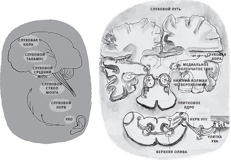 Рис. 2.3. Слуховой путь в мозге, соответствующий схеме слева. Акварельная иллюстрация д-ра Арнольда Старра, впервые использовавшего реакции мозга на звук для оценки неврологического здоровья. Воспроизведено с разрешения; фото Тома Лэмба.