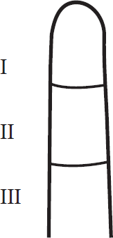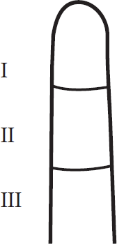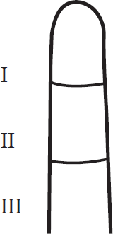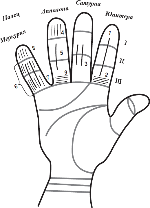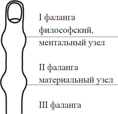 Узел между первой и второй фалангами пальца (первый узел) – философский – указывает на порядок в мире идей, между второй и третьей (второй узел) – указывает на порядок в мире материальных вещей, у основания пальца (третий узел) – указывает на порядок в домашних делах.