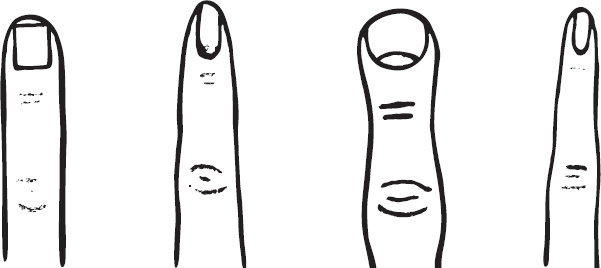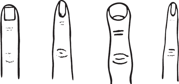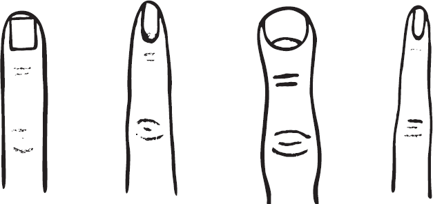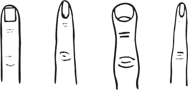 Квадратные пальцы. Люди с квадратными пальцами имеют первую квадратную фалангу. На ногтевой фаланге каждый такой палец похож на хорошо очерченный прямоугольник. Хозяин таких пальцев по натуре реалист, очень пунктуален, внимателен к своему поведению и придерживается строго заведенного порядка. Все делают методично и получают удовольствие от хорошо проделанной работы. По своей природе это очень большие трудяги. Он логичен, традиционен, предпочитает проверенный путь, а не что-то новое и необычное. Это очень дисциплинированные, пунктуальные, практичные люди. Уважают порядок и закон. Очень умные, способные и могут добиться успеха. Действует разумно и решительно.