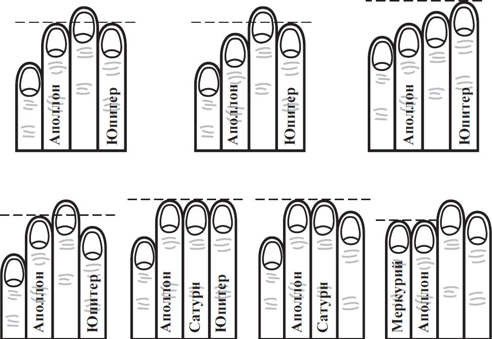 Юпитер короче Аполлона – заниженная самооценка, неуверенность в себе. Такой человек часто недооценивает себя и свои способности, особенно если линия головы и жизни начинаются вместе. Это творческая личность.