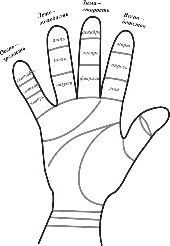 4 × 3 = 12, в году 12 месяцев, каждая фаланга представляет 1 месяц, каждый палец соответствует определенному времени года и определенному периоду жизни.