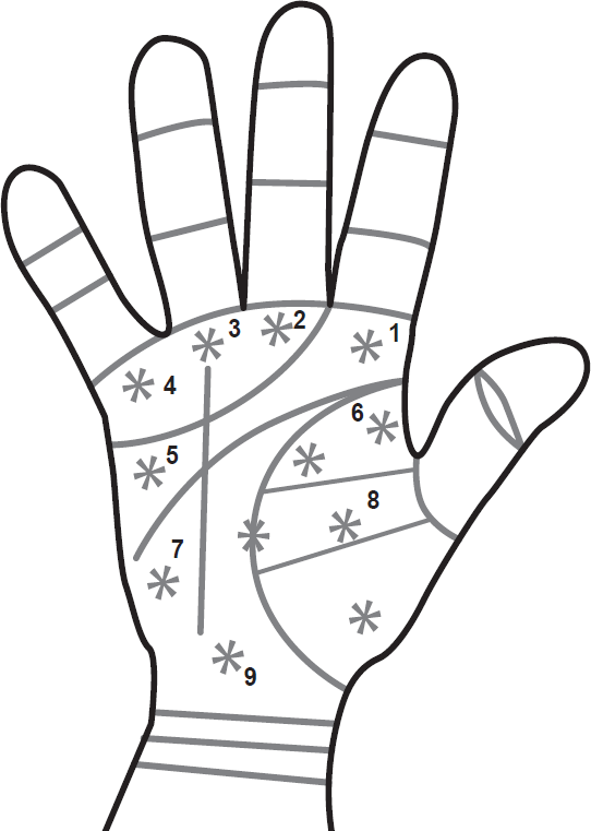 8. Звезда на бугорке Венеры – в центре – успех в любовных делах с приобретением богатства; к наружной стороне бугорка – успех в бизнесе с успешными людьми, в любви; внизу бугорка – неприятности от женщины.