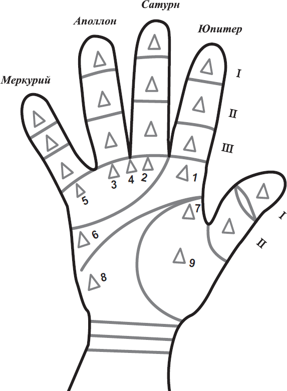 1. Треугольник на бугорке Юпитера обещает хорошую карьеру, у человека дипломатическая проницательность, тонкая политическая прозорливость.